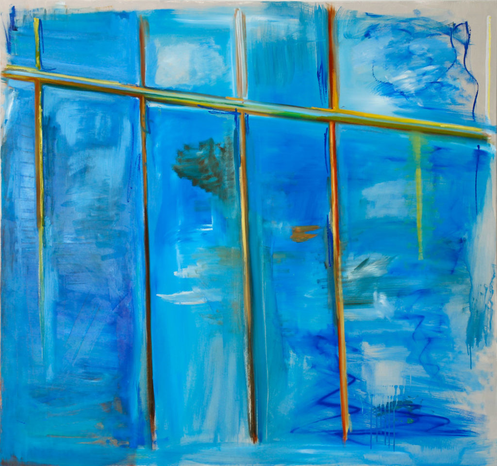 Gitter im Blau (die Sonne scheint), 140 x 130 cm, Öl auf Baumwolle
